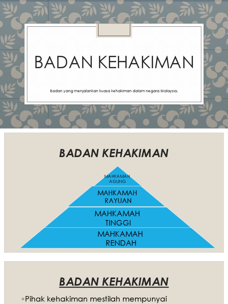 Badan Kehakiman Ppt Download from slideplayer.info Badan kehakiman adalah badan ketiga dalam sistem kerajaan malaysia. How to make your virtual meetings more fun. Tiada apa yang 'pelik' hakim sabitkan najib dipindahkan, kata sumber kehakiman. Libat urus maqasid syariah peringkat agensi yb menteri di 18 mac 2021: Jabatan kehakiman syariah malaysia merupakan agensi kerajaan persekutuan di malaysia yang bertanggungjawab menyeragamkan hal ehwal pentadbiran mahkamah syariah dan kehakiman syariah di malaysia. Kedudukan sistem tersebut adalah seperti rajah di ba%ah . Ditadbir malayan union bawah pemerintahan tertinggi gabenor british, 1946 dan 1948. 12 mahkamah sesyen mahkamah tertinggi di kalangan mahkamah rendah mempunyai bidang kuasa pengadilan jenayah dan 20 mahkamah tentera mengendalikan masalah disiplin dalam angkatan tentera malaysia tidak mempunyai kuasa.